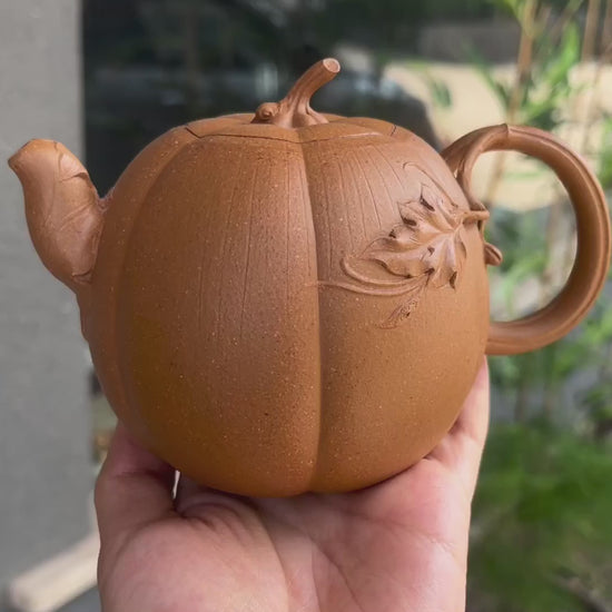 This classic pumpkin-shaped teapot is a celebrated form in Yixing teaware, but this piece goes further — the artisan has captured not just the outline of the pumpkin, but its entire spirit. The teapot body resembles a ripe pumpkin ready to drop from the vine, symbolizing fullness and harvest. The lid knob and handle are skillfully shaped as twisting pumpkin vines, adding both visual dynamism and realistic texture. The spout mimics a curled pumpkin leaf, intricately carved with lifelike precision, while another mature leaf gracefully extends from the handle, appearing aged yet vigorous.