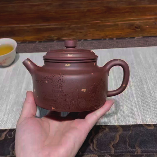 Decoration: The teapot features an engraving of the "Qing Gong Tu" (清供图), symbolizing that good things are about to happen. The teapot also has gold dust sprinkled on it, enhancing its luxurious appearance.