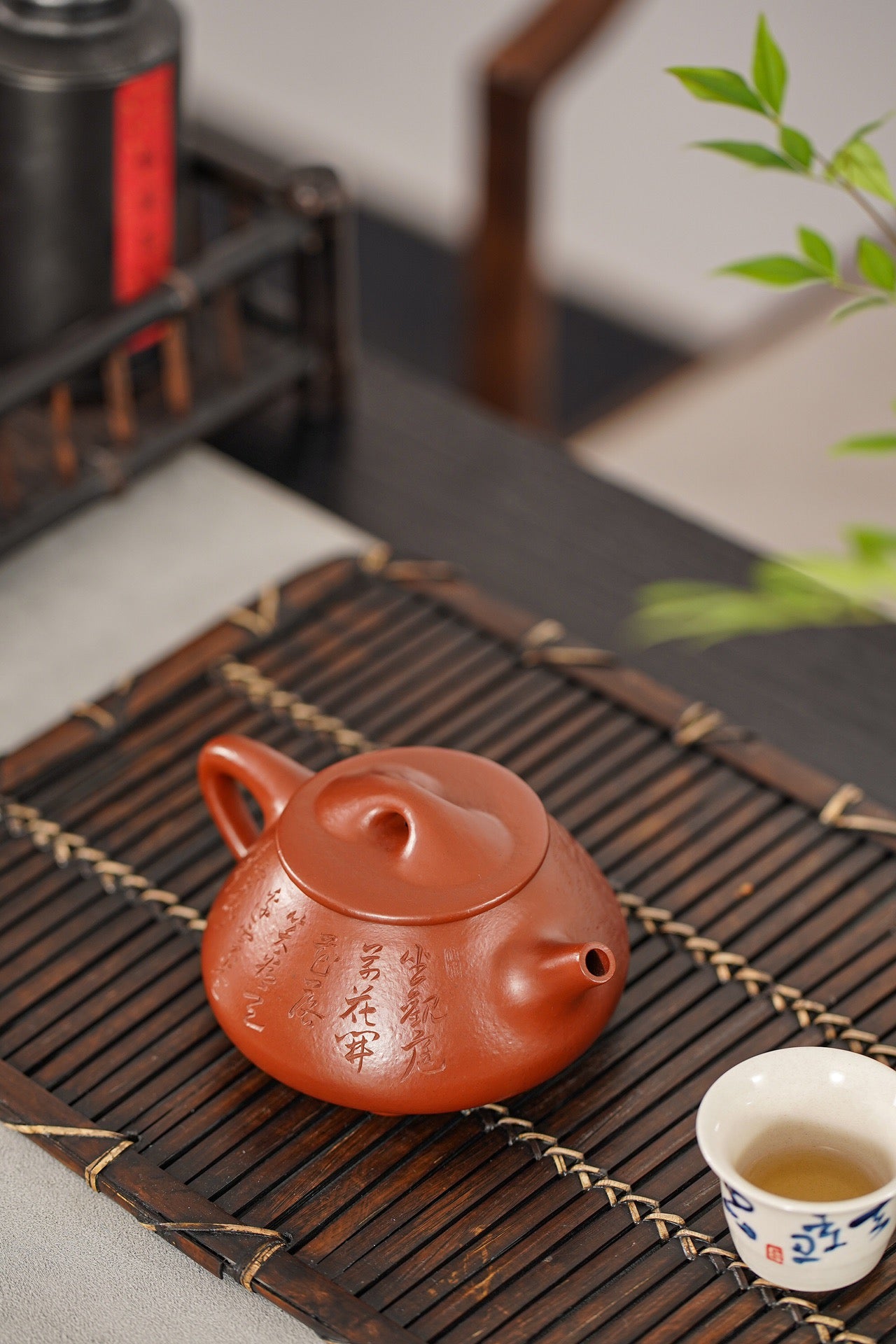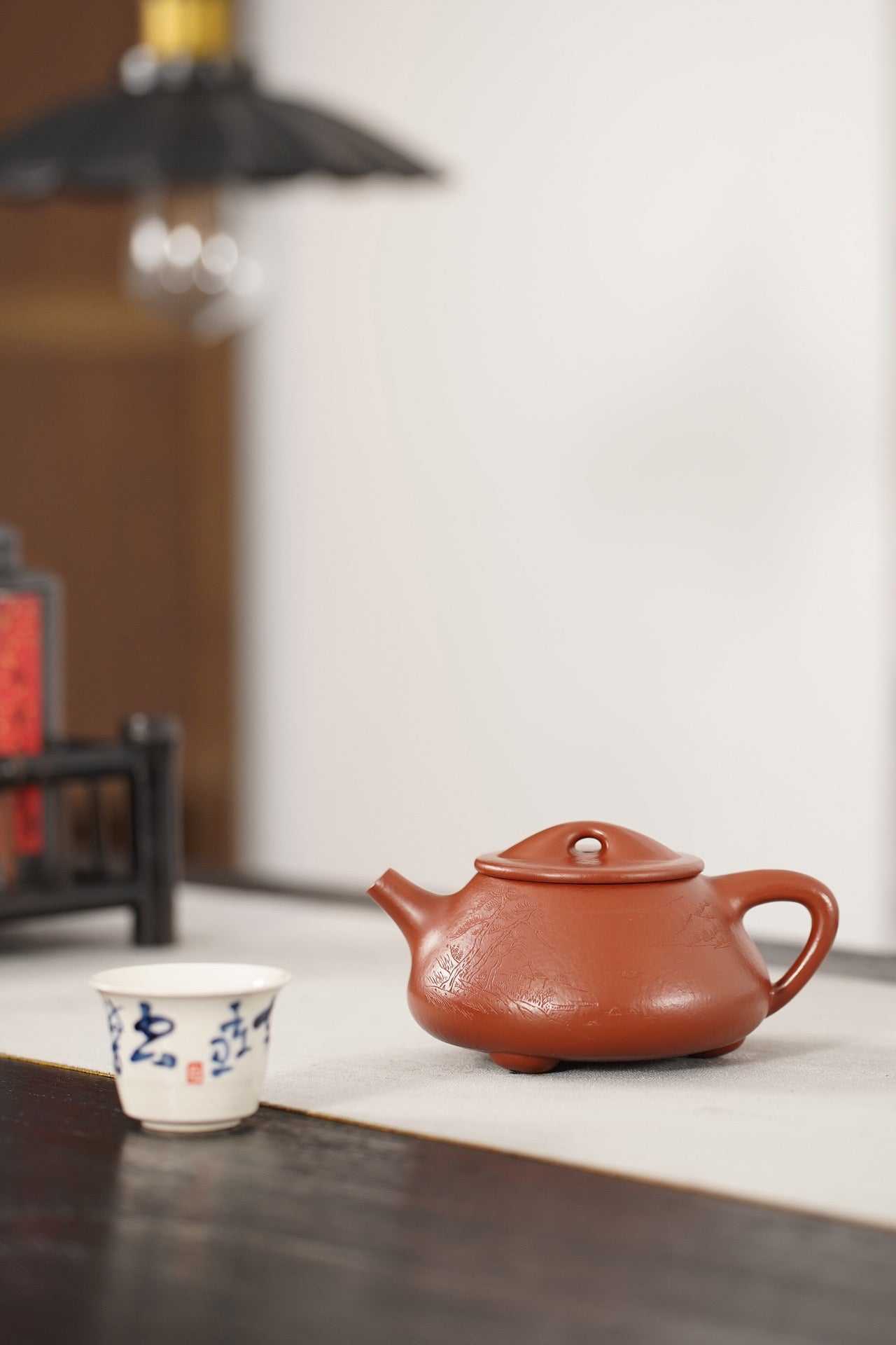 The teapot is crafted from authentic original ore coarse-grain Dahongpao Zhuni, a premium Yixing clay known for its deep red hue, rich texture, and excellent porosity — ideal for enhancing the flavor and aroma of tea over time. Its form follows the revered “Shipiao” silhouette, famously favored by Master Gu Jingzhou, with a slightly flared body, three-footed base, and balanced proportions that convey both elegance and grounded strength.