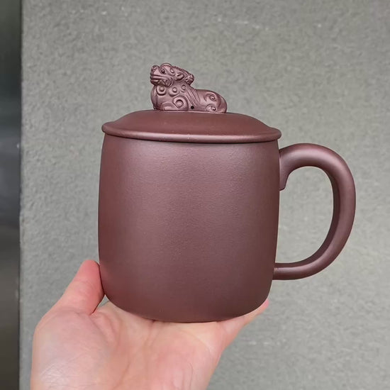 The form of the teacup is balanced and minimalist, allowing the natural beauty of the clay to shine. Atop the lid sits a delicately sculpted Qilin — a mythical creature in Chinese folklore symbolizing auspiciousness, nobility, and protection. This artistic detail adds not only a visual highlight but also imbues the cup with deep cultural meaning.