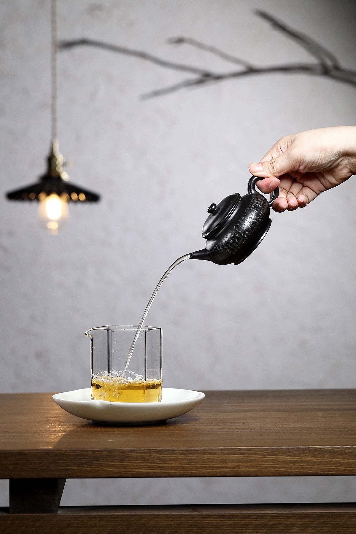 The teapot is crafted from authentic original ore Zhuni clay, and uniquely fired using the rare and ancient Wuhui (ash-sealing) technique. This process results in a deep black surface with natural variations and a rich, velvety luster — a mark of exceptional firing control and kiln mastery. The form follows the traditional “Flat Shui Ping” silhouette, known for its low and wide body that ensures optimal heat retention and balanced brewing.